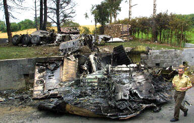 圖文:一警官從墜毀的圖-154殘骸前經(jīng)過 2002年07月03日 14:30 德國當(dāng)?shù)貢r(shí)間7月1日夜(北京時(shí)間2日晨),一架DHL公司的波音757貨機(jī)和俄羅斯巴什基爾航空公司的圖-154客機(jī)在德國巴登-符騰堡州于伯林根鎮(zhèn)上空相撞并墜毀,造成71人死亡,其中包括52名兒童。圖為一名警官從墜毀的圖-154殘骸前經(jīng)過。(春風(fēng))