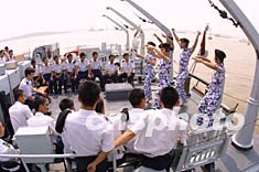 中國海軍駐上海某部戰(zhàn)士演出隊(duì),冒著八月的酷暑在掃雷艇上為水兵表演文藝節(jié)目。作者:張海峰