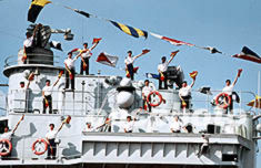 圖:水兵們?cè)谂炌媳硌萜煺Z"祖國、你好!"