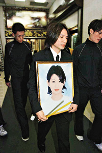 據(jù)香港大公報報道,世榮昨日一身黑色西裝,一早在靈堂打點一切,靈堂外寫著“葉府治喪”,旁邊則是“葉門許韻珊夫人治喪處”,表明二人是夫婦關(guān)系。Cynthia舅父周比利,還有朱茵、黃貫中到場;而各大唱片公司滾石、環(huán)球、環(huán)球高層陳少寶、黃家強亦有送上花牌悼念。喪禮采用道教儀式,世榮的花圈放在中央,上書“韻珊愛妻靈右Good bye my love I Love You世榮”;而世榮的父母亦以“家姑”﹑“家翁”身份送上花圈。