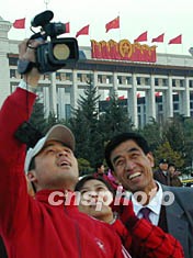 為迎接中共“十六大”召開,天安門廣場布置一新,廣場日前將巨型燈箱標語牌吊裝完成。一名青年十一月初在北京天安門攝像時,吸引好奇的旁觀者爭睹廣場新景。作者:張煒