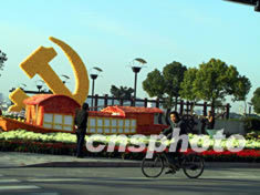 金秋菊展是浙江寧波鎮(zhèn)海傳統(tǒng)的盛大展會(huì)。喜迎中共“十六大”的主題則是今年菊展的一大看點(diǎn)。圖為正在當(dāng)?shù)匮亟G地上展出的“南湖紅船”景點(diǎn)。作者:崔煜芳
