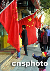 中新社北京十一月五日電(記者張素平)隨著中共十六大會期的漸近,北京街頭喜意漸濃,一面面鮮艷的國旗開始招展在北京的大街小巷。主要道路旁家家戶戶都在門前掛起國旗,紙制手持小國旗亦持續(xù)熱銷。