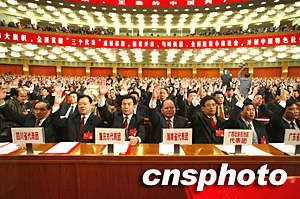 中國共產(chǎn)黨第十六次全國代表大會十四日上午在北京人民大會堂閉幕,主席臺上下舉手表決通過關(guān)于十五屆中央委員會報告等決議。中新社記者 毛建軍 攝