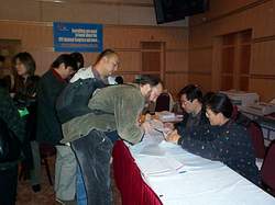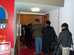 央視國際播發(fā)專稿報道說,今天下午,記者在十六大新聞中心外國記者接待處見到,等候領取新常委見面會請柬的外國記者排起了長長的隊伍,一直延伸到接待處的大門口外。