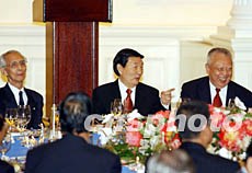 今晚的香港禮賓府華燈齊放,氣氛熱烈而溫馨。當(dāng)朱镕基總理和夫人勞安在香港特區(qū)行政長官董建華和夫人董趙洪娉的陪同下步入宴會廳時,在場的香港各界人士報以熱烈的掌聲。朱镕基總理也微笑著鼓掌向大家致意。