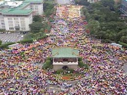 雖然有些縣市人數(shù)減少,但因地緣關(guān)系,北縣人數(shù)反而增加,從近午開始,中正紀念堂就開始人滿為患,從高處俯瞰,只見到黑壓壓一片,十分驚人。而國民黨主席連戰(zhàn)也在午后1時,抵達現(xiàn)場向農(nóng)漁民“致意”。