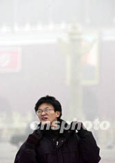 十二月三日上午,今冬第一場大霧籠罩北京。一位年輕人面對天安門廣場的濃霧緊鎖眉頭,顯得很心煩。作者:張煒
