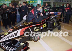 世界聞名的米納爾迪車隊12日攜帶F1雙座位方程式賽車在北京金港汽車公園亮相,將于14、15兩日在此演示,車迷花上30000元人民幣可在2.6公里的賽道上享受3圈的刺激。作者:趙振清