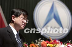 十二月十六日,中國最大的運載火箭設(shè)計研制基地——中國運載火箭技術(shù)研究院在北京南郊紀念建院四十五周年。該院研制的長征二號F火箭已連續(xù)三次成功發(fā)射“神舟”飛船。日前,長征火箭再次聳立在酒泉衛(wèi)星發(fā)射中心,等待著將“神舟四號”飛船送入太空。圖為該院院長吳燕生在紀念會上發(fā)表主旨講話。作者:張煒