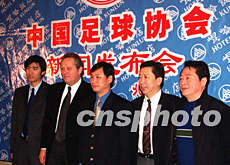 中國足球協(xié)會二十二日在北京正式宣布荷蘭人阿里·哈恩成為中國國家足球隊主教練。圖為金志揚、朱元和、南勇、阿里·哈恩(從右至左)等人在新聞發(fā)布會上。作者:武仲林
