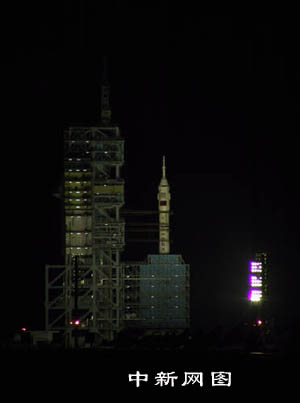 發(fā)射前半小時(shí),“擁抱”著“神舟”四號飛船和“神箭”組合體的發(fā)射塔架旋轉(zhuǎn)平臺打開了一半。 中新社記者 孫自法 攝