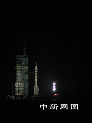 發(fā)射前十五分鐘,發(fā)射塔架旋轉(zhuǎn)平臺完全打開,“神箭”托舉著“神舟”蓄勢待發(fā)。 中新社記者 孫自法 攝
