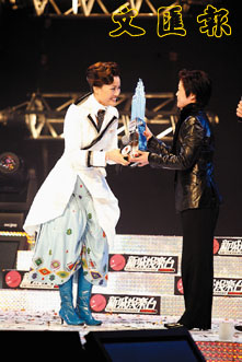 曾經(jīng)一度雄霸樂壇的四大天王,今年只得劉德華一人繼續(xù)和一班年輕歌手競逐。華仔上臺領獎時表示要多謝一直以來支持自己的人,在這樣的環(huán)境下仍對他鼓勵的朋友,大家不用擔心,他會好好地活下去,而此時和華仔曾打官司的中建主席麥紹棠也在臺下支持其子麥浚龍。