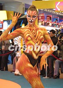 七日在上海國際會議中心舉行的柯達嘉年華會上,主辦商請來模特現(xiàn)場表演人體彩繪,為盛會助陣。作者:湯彥俊