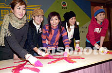 大型慈善籌款節(jié)目「慈善星輝仁濟夜」1月8日在香港舉行記者會,藝員葉璇、張美妮、朱凱婷、姚嘉妮、劉曉彤(圖左起)在會上“即席揮毫”作畫。鄧慶樂 攝