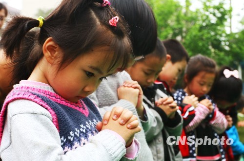 圖:河北小學(xué)生為玉樹地震遇難同胞祈禱