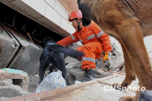 圖:搜救犬黑貝玉樹地震廢墟上的一個(gè)清晨