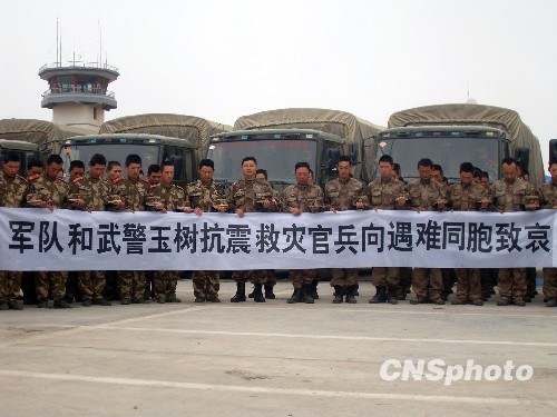 圖:玉樹機(jī)場(chǎng)抗震救災(zāi)官兵向遇難同胞致哀