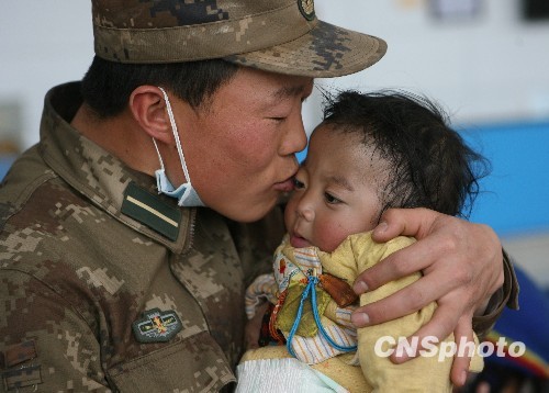 青海玉樹地震:解放軍照看受傷嬰兒
