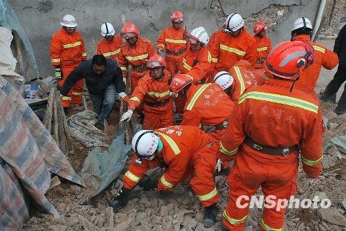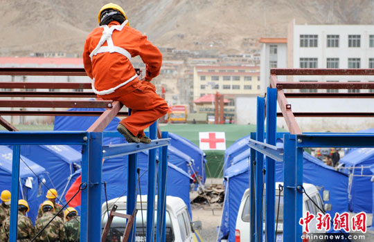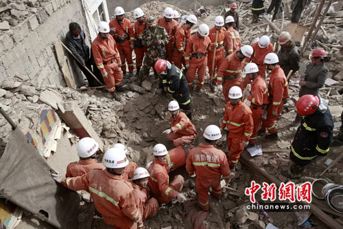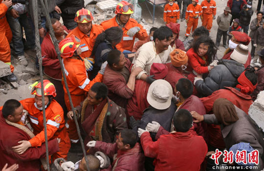 圖:西藏消防總隊(duì)在玉樹地震現(xiàn)場(chǎng)救援