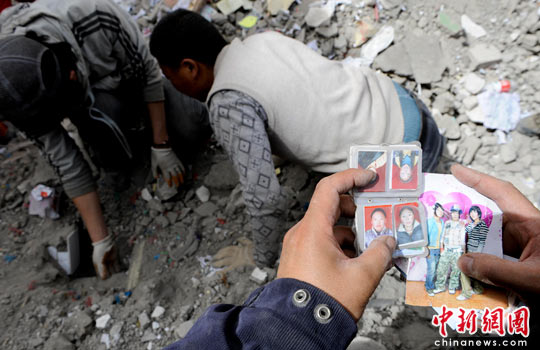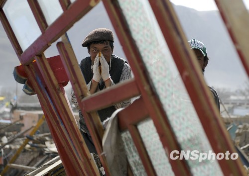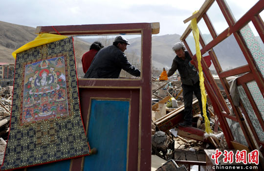 戰(zhàn)士為玉樹信眾清理地震廢墟中的法器