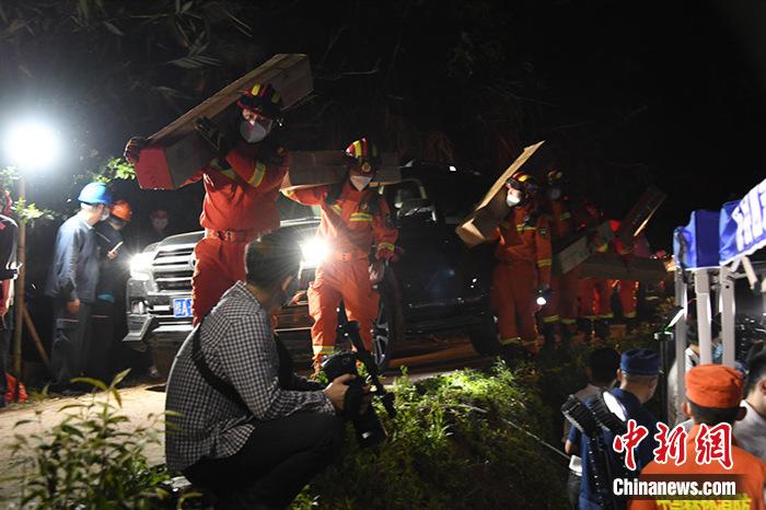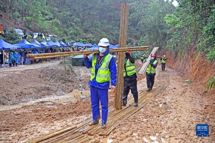 墜機(jī)事故現(xiàn)場(chǎng)下雨 工作人員鋪設(shè)竹排小道