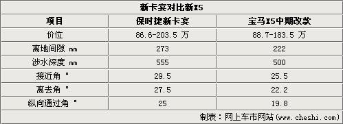但是保時捷為卡宴標配的空氣懸架系統(tǒng)因其能夠?qū)崿F(xiàn)車輛離地間隙的提升,因而在最大離地間隙、涉水深度以及接近角離去角的部分非常出色,相比BMW的X5來說這部分的優(yōu)勢在一些惡略路況下就會顯得非常明顯了。