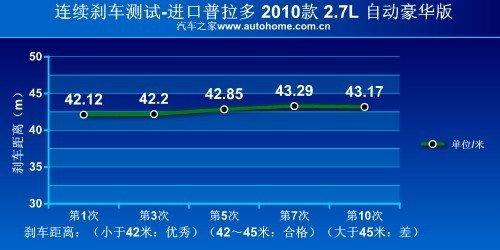 加速偏弱或許對一些人來說不是問題,而剎車無論如何都不能含糊。這一點上普拉多的表現得很稱職。盡管由于車身較高,剎車姿態(tài)看起來有些令人不安,但從100公里/小時剎車到靜止只需要42.85米,而且剎車一直穩(wěn)定在43米左右,已經算是非常不錯的成績。