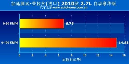 在加速測試中,2.7L發(fā)動機動力較弱的特點暴露無遺。起步時車輛出奇的安分,發(fā)動機被無情的壓制在低轉速區(qū)間,而攀升的過程又顯得特別漫長。另一方面,齒比稀疏的四擋變速箱對于這種動力偏弱的車型來說是不太利于加速的。因此,普拉多0-100公里/小時跑出14.83秒的加速成績也就不足為奇了。