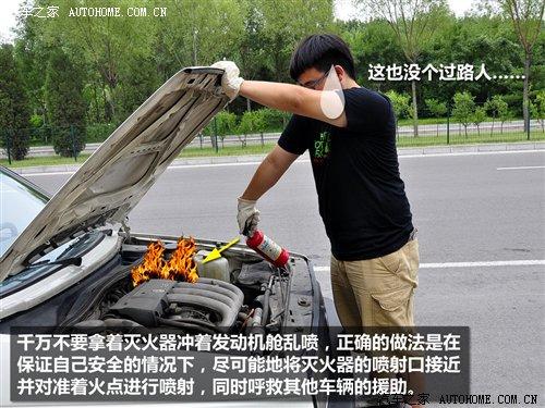 步驟三:發(fā)動機蓋打開后由于空氣對流增強,火苗會迅速變大,這時我們不能驚慌,拿著滅火器沖著發(fā)動機艙亂噴,在保證自己安全的情況下,盡可能地將滅火器的噴射口接近并對準著火點進行噴射,同時呼救其他車型的援助(因為車用的那種小罐滅火器的容量有限)。