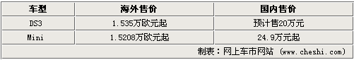 而在目前雪鐵龍DS系列車型僅有DS3一款,不出意外的話它將是長安-標(biāo)致雪鐵龍推出的首款車型,預(yù)計將在2012年投產(chǎn)。DS3是一款雙門運動型小車,競爭對手則是Mini,在歐洲地區(qū)的售價1.5萬歐元起。Mini在國內(nèi)的售價為24.9萬元起(海外售價同樣是1.5萬歐元起),考慮到DS3國產(chǎn)的原因,它的售價很可能會在20萬元左右,比Mini要便宜一些。而在國產(chǎn)前,這款車也在4月的北京車展上亮相過,看來是早有國產(chǎn)準(zhǔn)備。