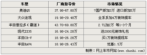 在文中提到的6款熱銷SUV車型中,加價賣車的情況似乎有所并沒有太多弱化的趨勢。加價幅度最大的是奧迪新晉高級SUV車型Q5,國產(chǎn)版車型全系加價3萬,進(jìn)口版車型全系加價5萬。豐田召回風(fēng)波的影響尚未煙消云散,旗下熱銷的SUV車型RAV4做出了1.5萬的讓利,與之前的加價形成了非常鮮明的對比。