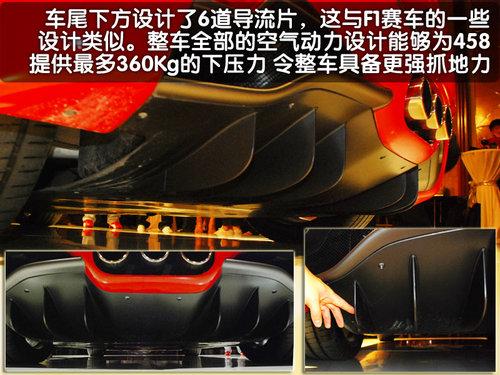 在458Italia的車尾底部,六道導(dǎo)流片在車輛高速行駛的時候為車輛提供充足的下壓力,以及后輪的附著力。在極限狀態(tài)下全車的因空氣動力學(xué)設(shè)計而產(chǎn)生的額外下壓力高達(dá)360公斤,這相當(dāng)于5-7名成年人的體重總和。