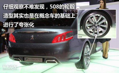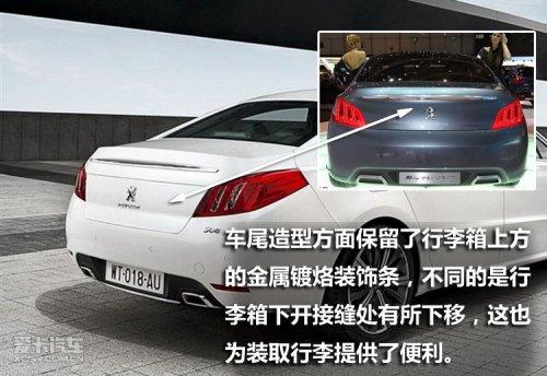 與概念車5 by Peugeot相比,車尾造型方面保留了行李箱上方的金屬鍍烙裝飾條,不同的是行李箱下開接縫處有所下移,這也為裝取行李提供了便利。左右雙開的排氣造型與5 by Peugeot保持一致。另外,原來LED和車體鑲嵌的背對雙C造型有所改變,變?yōu)榱烁咨a(chǎn)安裝的整體組合式設(shè)計,不過在燈體內(nèi)部的點亮部分會繼續(xù)保留概念車上的設(shè)計元素。