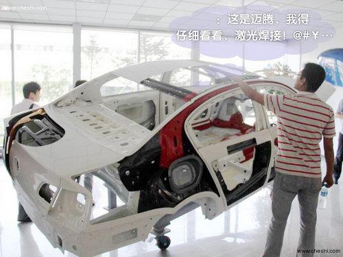 在焊裝車間的一進門位置,我們就看到了一臺邁騰的解剖車,這里只有車輛的結構件,不包含一些內飾配件。這個只剩下骨架的車身可以清楚的看到邁騰的車身結構是什么樣的。