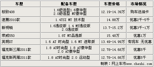售價在15萬左右的車型配備后排出風口的車型包括了標致408、速騰2010款、新明銳、榮威550、英朗XT和?怂箖蓭龓F渲袠酥408和速騰2010款全系均采用此項配置,但是由于價格原因只有部分入選。除了英朗XT外,其余6款車都有現(xiàn)金優(yōu)惠。