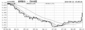 受此利好消息影響,盡管大盤震蕩,但首鋼股份已連續(xù)四日收陽。昨日,首鋼股份漲停,收盤于每股4.39元。