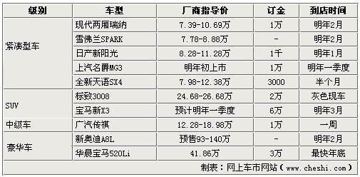 本屆廣州車展上市新車并不比北京車展多,但是所上車型基本都屬于重量級產(chǎn)品。據(jù)各廠家經(jīng)銷商銷售人員表示,十款新車大部分目前都已經(jīng)開始接受預(yù)定,并且提車時間也都集中在2011年初的第一季度,相信喜歡這些車型的朋友們?nèi)绻鍪值脑,現(xiàn)在就可以進(jìn)行預(yù)定了。