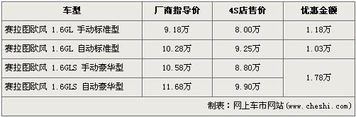據(jù)經(jīng)銷商處銷售人員介紹,賽拉圖歐風(fēng)全系最高出現(xiàn)1.78萬元的優(yōu)惠。賽拉圖歐風(fēng)在售的有4個車型,入門級的1.6L手動標(biāo)準(zhǔn)版的優(yōu)惠金額為1.18萬元,售價從廠商指導(dǎo)價9.18萬元降到8萬元,1.6L豪華版的手動版和自動版車型都經(jīng)全系最高1.78萬元優(yōu)惠后,售價分別降至8.8萬元和9.9萬元。銷售人員還介紹,目前賽拉圖歐風(fēng)車型比較緊張,現(xiàn)車數(shù)量一般。