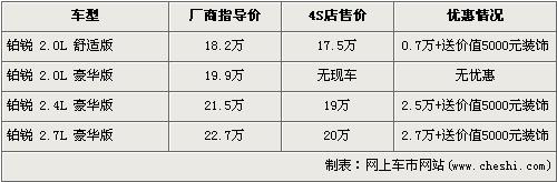 據(jù)北京克萊斯勒4s店銷售人員介紹,克萊斯勒鉑銳已經(jīng)停止進(jìn)口,除了2.0L 豪華版已沒有庫存車外,經(jīng)銷店內(nèi)還剩部分其他車型庫存車。經(jīng)7000元優(yōu)惠后,2.0L舒適版的售價從18.2萬元下降到了17.5萬元。2.4L豪華版經(jīng)2.5萬元優(yōu)惠后,售價降到了19萬元。全系最高配的2.7L豪華版經(jīng)2.7萬元優(yōu)惠后,售價下降到了20萬元。購買鉑銳的消費者在得到現(xiàn)金優(yōu)惠的同時,還可以得到價值5000元的內(nèi)部裝飾。