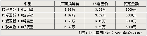 據(jù)比亞迪汽車4S店銷售人員介紹,比亞迪F0愛國版igo系列車型的現(xiàn)車并不是很齊全,實用型和舒適型都有現(xiàn)車,尊貴型和旗艦型則需要預(yù)訂,大概10-15天即可提車。而目前1.0L實用型和舒適型都有現(xiàn)車,其中實用型可以優(yōu)惠6000元,優(yōu)惠后售價已經(jīng)接近3萬;而其他車型只可以優(yōu)惠5000元現(xiàn)金。