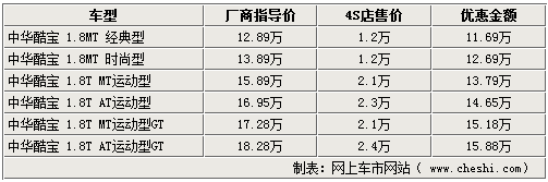 酷寶系列車型,不僅外形時尚,動力也相當充沛,不僅可與進口跑車如蓮花競速相媲美,也帶動了自主跑車市場的競爭。近期網(wǎng)上車市網(wǎng)站了解到,隨著市場競爭的加劇,現(xiàn)在北京的中華4S店內(nèi)最高可給出24000元的現(xiàn)金優(yōu)惠,令此車型再次引起關(guān)注。具體詳情如下: