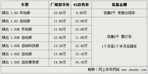 據(jù)東風日產(chǎn)4s店銷售人員介紹,目前騏達全系車型也有現(xiàn)金8千元的優(yōu)惠。而同樣現(xiàn)在騏達、頤達兩款車型為訂單生產(chǎn),北京地區(qū)4S店目前只有個別1.6J銀色時尚版車型,其他款車型均無現(xiàn)車,購買者需交1000元訂金約等1個月至1個半月的時間。
