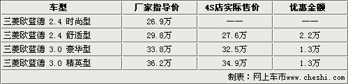 歐藍(lán)德是三菱引入國內(nèi)銷售的中型SUV車型,同時歐藍(lán)德也是三菱汽車第一款采用轎車底盤形式生產(chǎn)的SUV車型。近日我們從三菱汽車官方獲悉到,全新一代的歐藍(lán)德車型將于10月13日正式上市,首次推出的車型分為2.4和3.0兩種排量,共計4款車型。與此同時根據(jù)網(wǎng)上車市價格監(jiān)測系統(tǒng)顯示,目前銷售的09款歐藍(lán)德全系均出現(xiàn)了大幅優(yōu)惠,最高降幅高達(dá)2.2萬元。具體車型售價見下表: