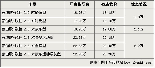 福特蒙迪歐-致勝出自福特最新開發(fā)的EUCD技術平臺,它采用了沃爾沃S80底盤技術。在歐洲,蒙迪歐致勝與皇冠成為競爭對手,是一款定位高于雅閣、凱美瑞之流的轎車。近日據(jù)網(wǎng)上車市價格系統(tǒng)檢測顯示,蒙迪歐-致勝全系最高優(yōu)惠2.2萬元,具體車型價格詳情請看下表: