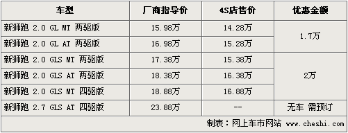 據(jù)東風悅達起亞4S店銷售人員介紹,目前獅跑有1.7萬元-2萬元不等的優(yōu)惠,其中2.0兩驅(qū)最低售價14.28萬元,現(xiàn)車目前顏色以黑色、銀色以及鈦銀色為主。部分車型顏色還是需要預訂,訂金為1萬元,1個月內(nèi)可以提到車。如消費者有意購買,到店詳談會有更優(yōu)惠的價格。北京地區(qū)各4S店由于訂單不同,各店銷售的現(xiàn)車顏色有所不同。
