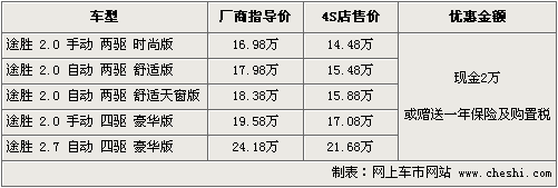 據北京現(xiàn)代北京地區(qū)4S店銷售人員介紹,途勝車型優(yōu)惠現(xiàn)金2萬元或贈送購置稅及全年保險,兩 項優(yōu)惠只能選擇其一。目前店內現(xiàn)車供應主要為銀色、黑色為主,四驅部分車型需要預訂,訂金5千元,一周左右時間可以提車。如消費者有意購買,到店詳談會有 更優(yōu)惠的價格。北京地區(qū)各4S店由于訂單不同,各店銷售的現(xiàn)車顏色有所不同。