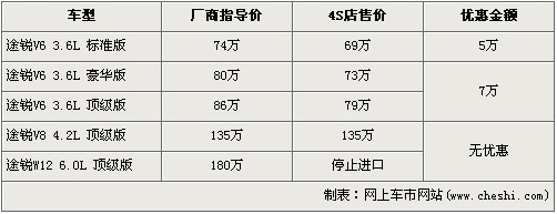 途銳是大眾首款引進(jìn)我國的SUV車型,在3.6L及4.2L率先上市后,大眾為了滿足消費者的更大胃口,緊接著又推出了搭載12缸發(fā)動機的6.0L車型。隨著大排量消費稅的頒布,給9月份后入關(guān)的大排量車型帶來了一次不小的沖擊,令大排量汽車價格都上調(diào)了不少。近日據(jù)網(wǎng)上車市價格系統(tǒng)監(jiān)測顯示,大眾途銳的6.0L車型已經(jīng)停止進(jìn)口,并且購買目前購車可以得到最高7萬元的優(yōu)惠,具體詳情請看下表: