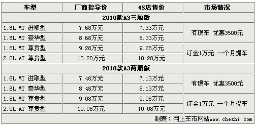 奇瑞A3是奇瑞汽車所生產(chǎn)的一款成功轉(zhuǎn)型的產(chǎn)品,自上市以來激起了廣大消費(fèi)者對(duì)自主品牌追捧的新浪潮。奇瑞A3外觀時(shí)尚、運(yùn)動(dòng),迎合時(shí)代潮流,超高的性價(jià)比造就了奇瑞A3的銷量直線上升。2010款奇瑞A3的表現(xiàn)也不遜色于老款產(chǎn)品,增加了更多時(shí)尚元素和實(shí)用配置。網(wǎng)上車市走訪了北京地區(qū)奇瑞4S店,得到了2010款奇瑞A3最新的市場(chǎng)消息,具體信息請(qǐng)參考下表:
